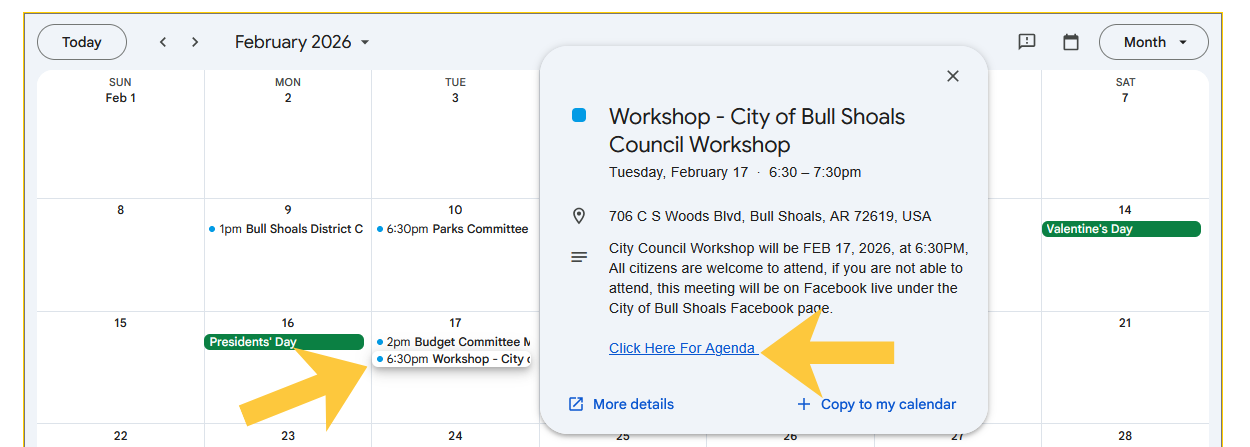 Meetings with agendas or other documents will have the link in the calendar event. If on a mobile device, click the date with a dot, click the event to show description of event, and you may have to scroll to see the complete event description and link.